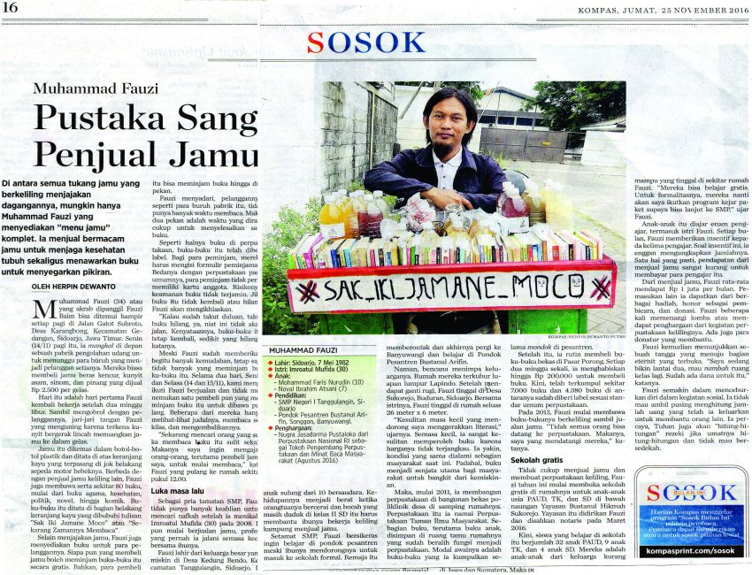 Muhammad Fauzi (35) nama lengkapnya. Tambahan nama Baim dibelakang namanya merupakan nama dari anaknya yang kedua. Jadilah nama panggilannya Fauzi Baim. Di desanya pria berkacamata ini di kenal sebagai penjual jamu keliling. Dengan mengendarai motor gerobaknya, Fauzi berangkat meninggalkan rumah sekitar pukul setengah tujuh pagi menuju para pelanggannya di Desa Karangbong dan Tebel Gedangan. Istimewanya, saat menjual jamu dia juga membawa buku-buku koleksi yang ada di perpustakaannya. Selain membeli jamu, para pelanggannya bisa membaca buku di tempat atau bahkan meminjamnya untuk dibawa pulang secara gratis.